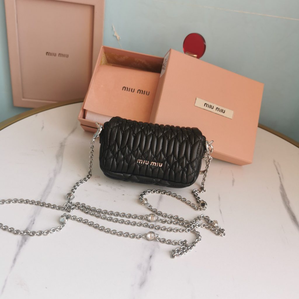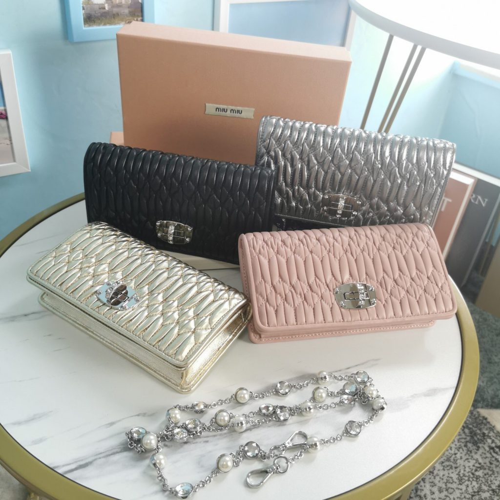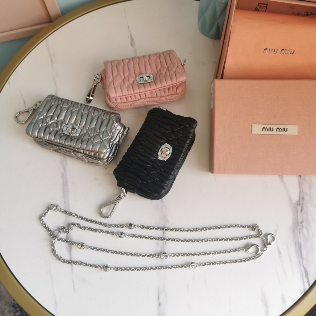 3, whatsapp +86 159 3921 9667The most popular bag must be the belt pack, this Belt Bag comes from Miu Miu New Collection. It is the new design with the sequins leather, and the back of the bag is for top quality matelasse lambskin. It comes with one metal chain and one leather strap, so you can carry it as a shoulder bag or belt bag.