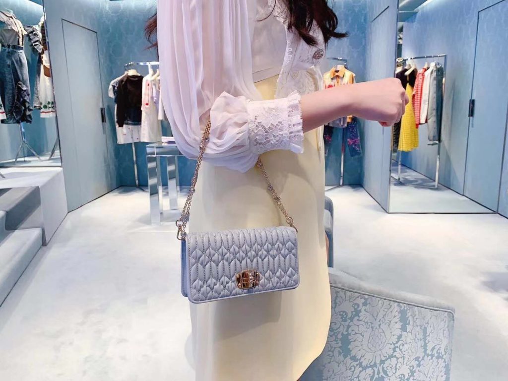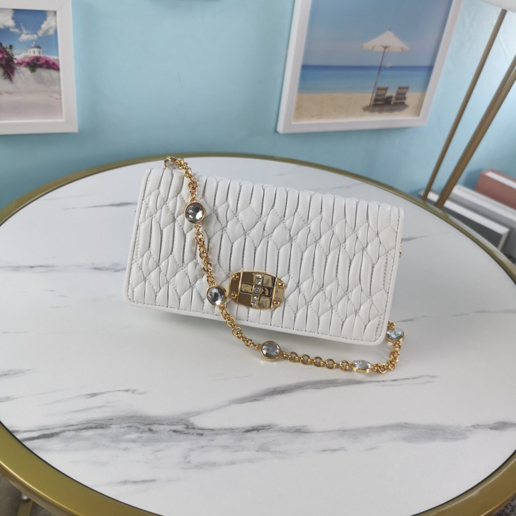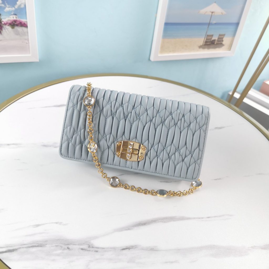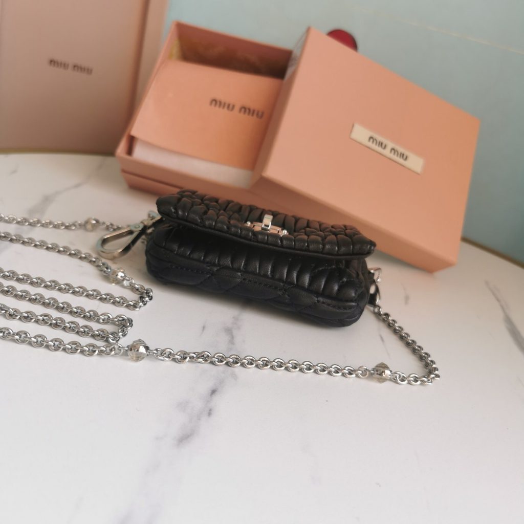 3, whatsapp +86 159 3921 9667The most popular bag must be the belt pack, this Belt Bag comes from Miu Miu New Collection. It is the new design with the sequins leather, and the back of the bag is for top quality matelasse lambskin. It comes with one metal chain and one leather strap, so you can carry it as a shoulder bag or belt bag.