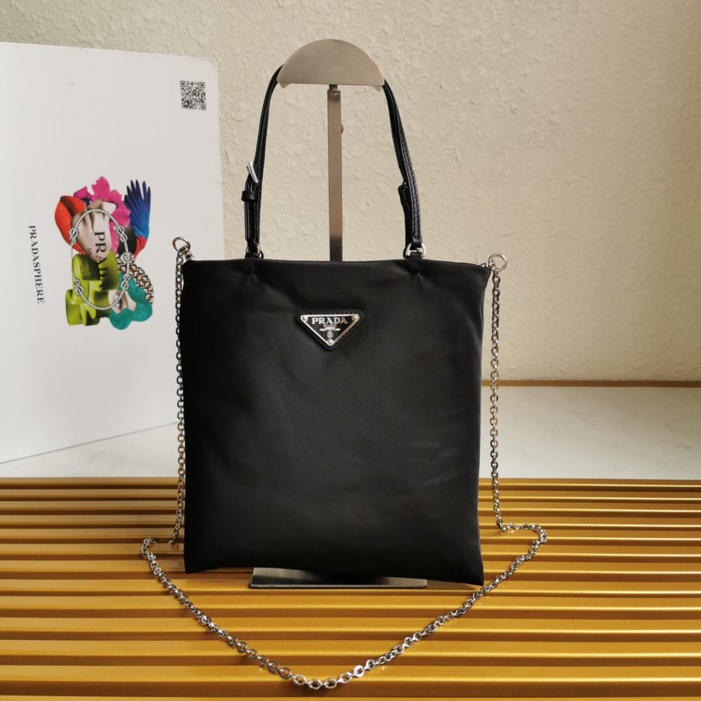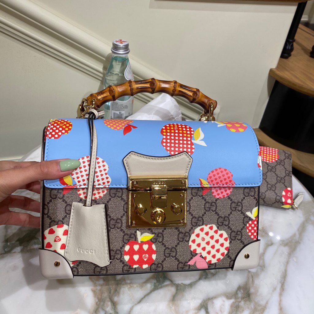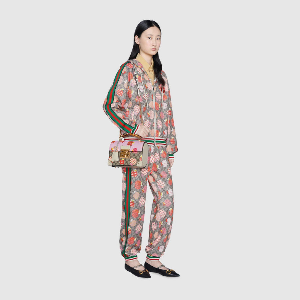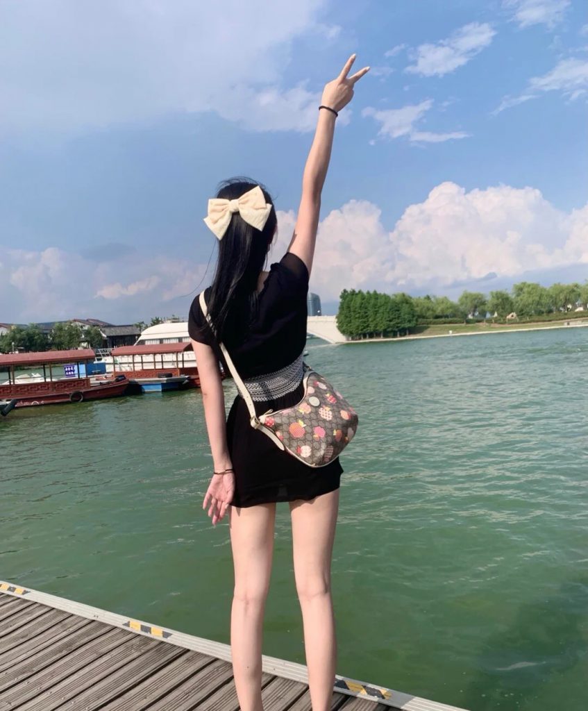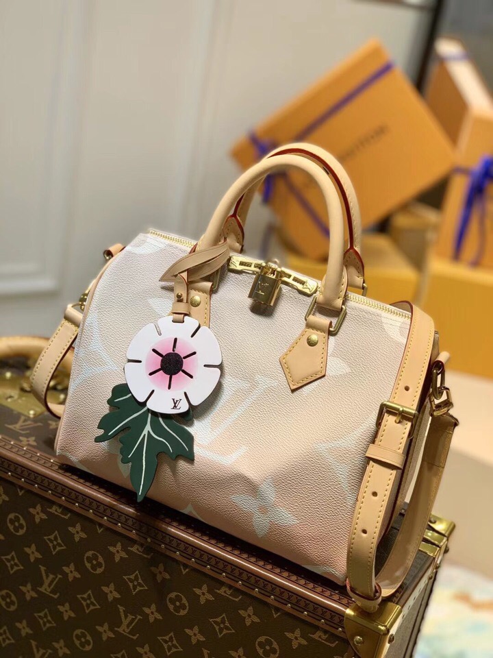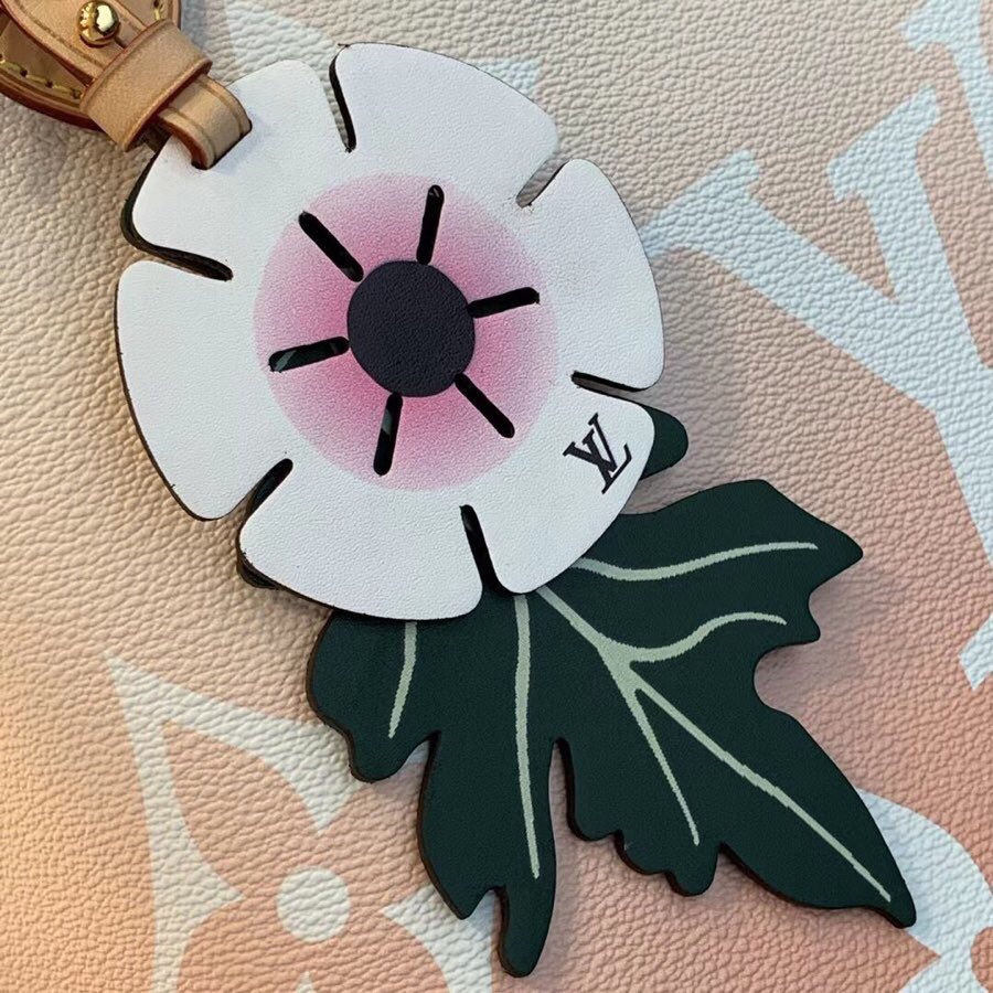 The bag’s side laces tighten for a sleek silhouette or loosen for a more casual look. It is accessorized with a leather flower charm.