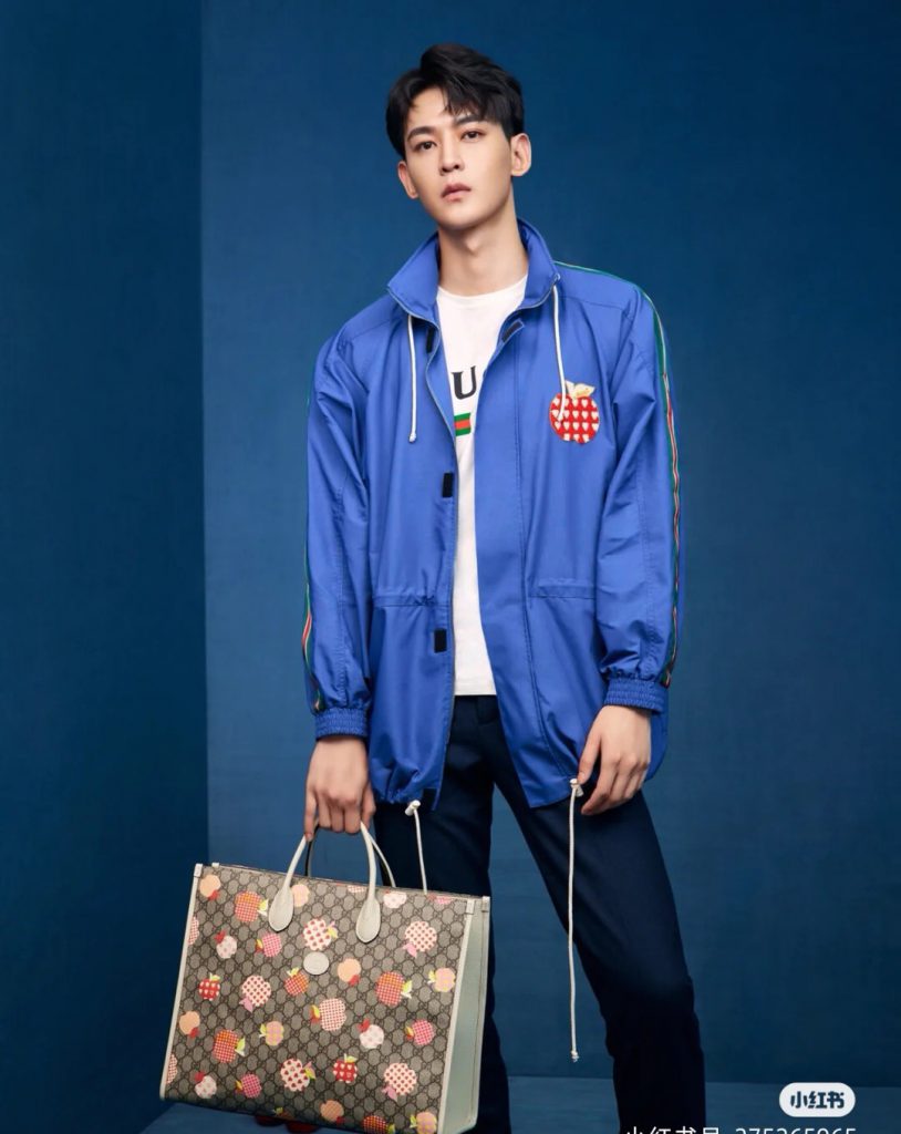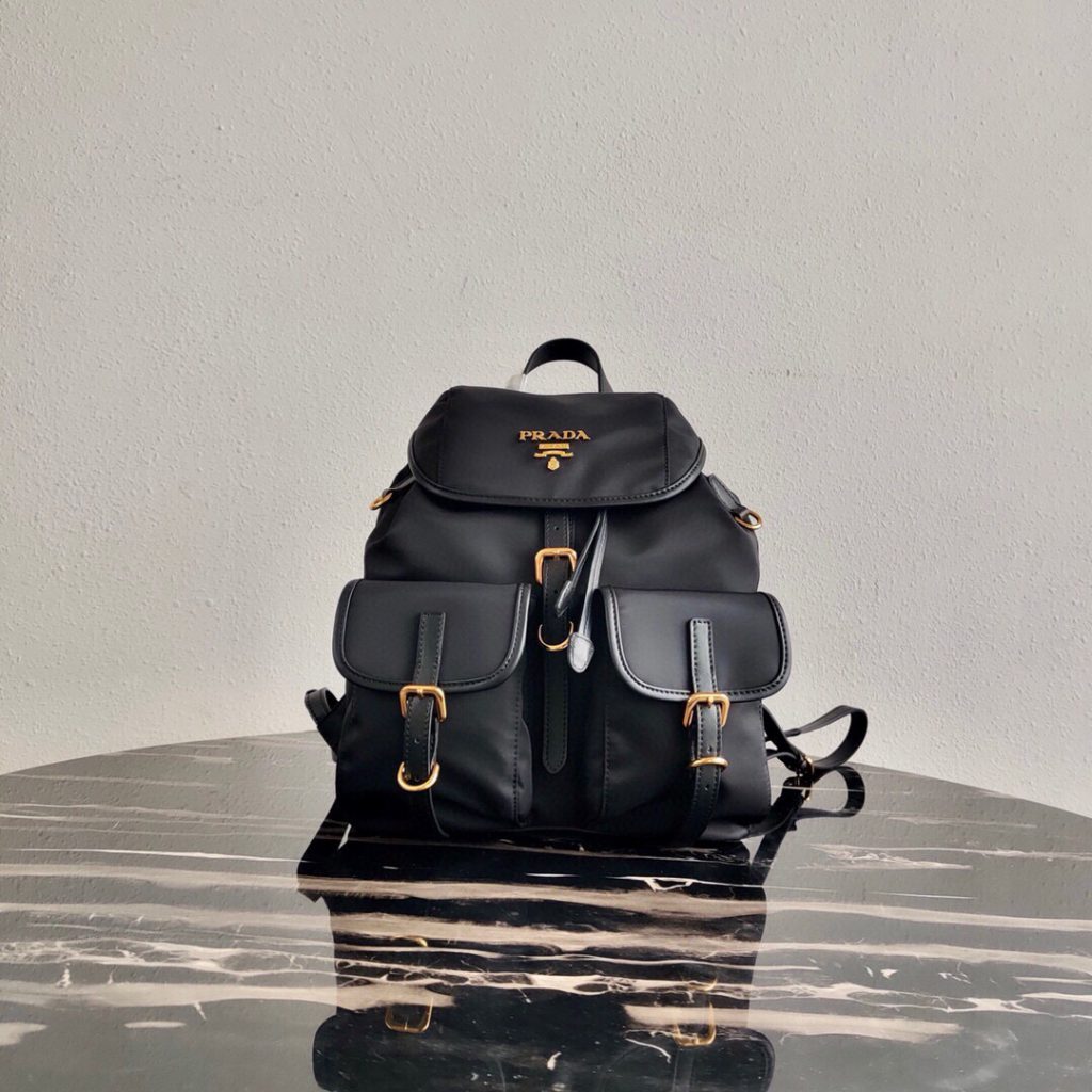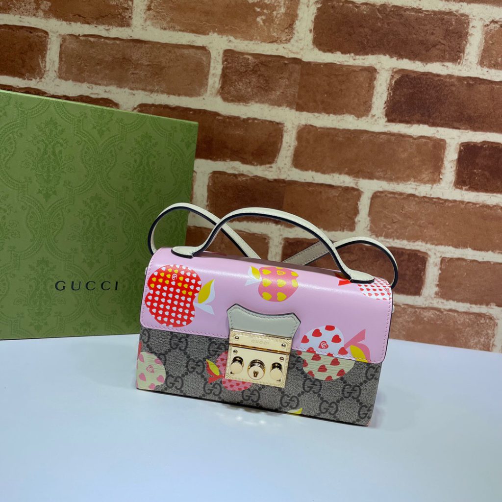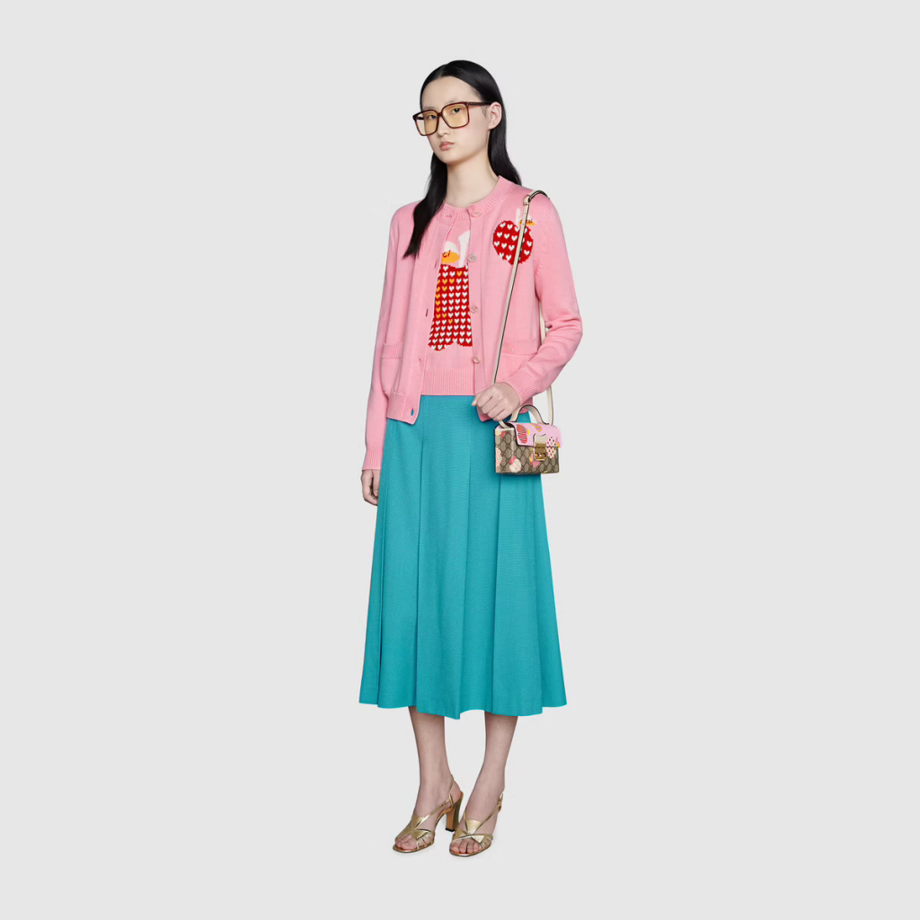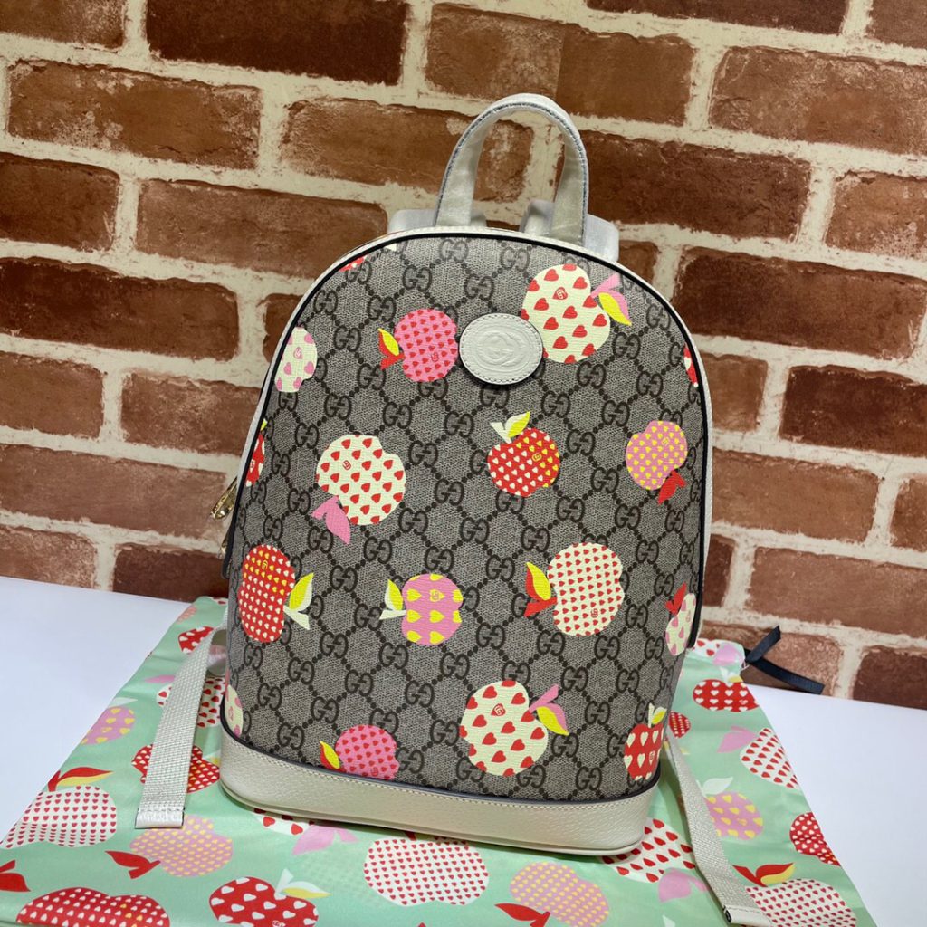 The bag’s side laces tighten for a sleek silhouette or loosen for a more casual look. It is accessorized with a leather flower charm.
