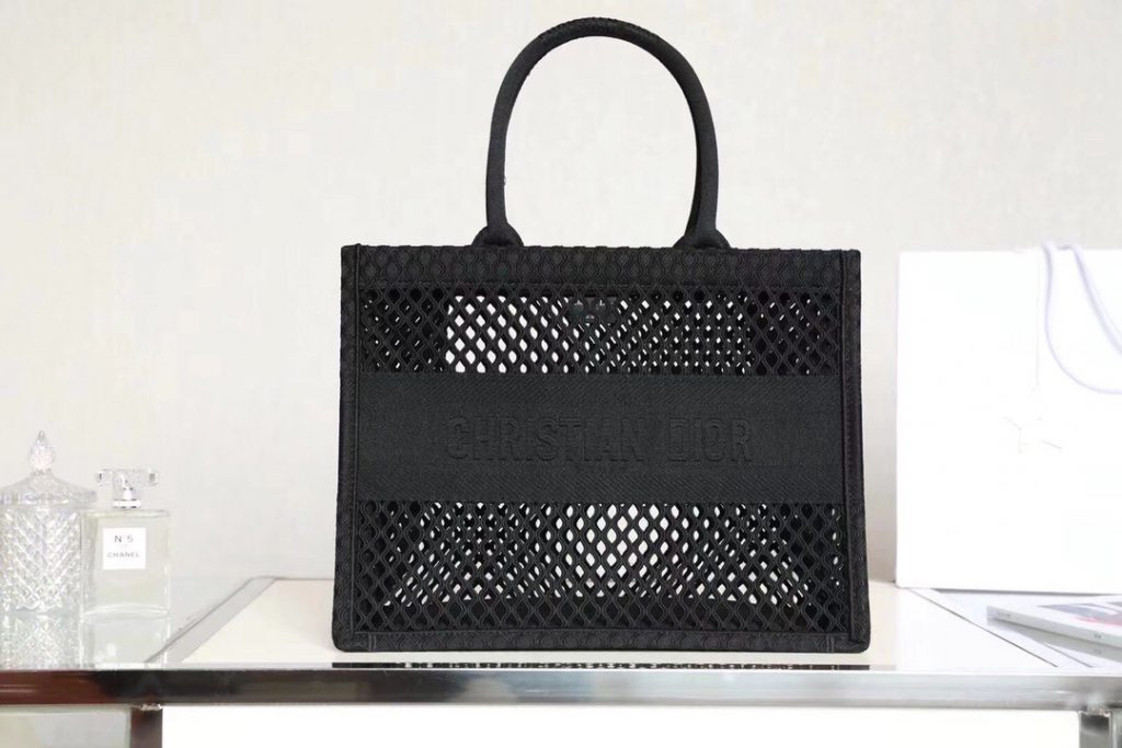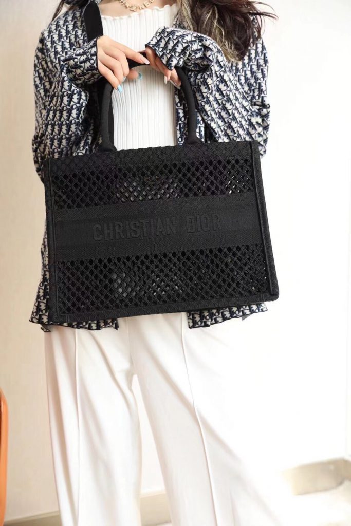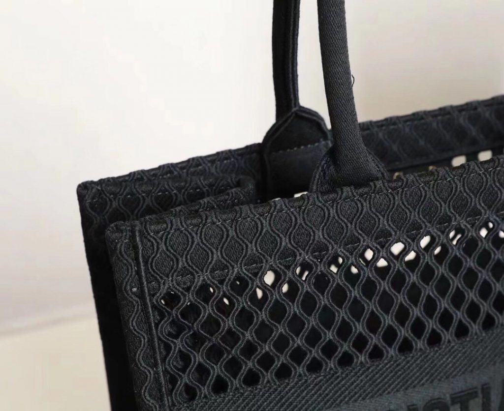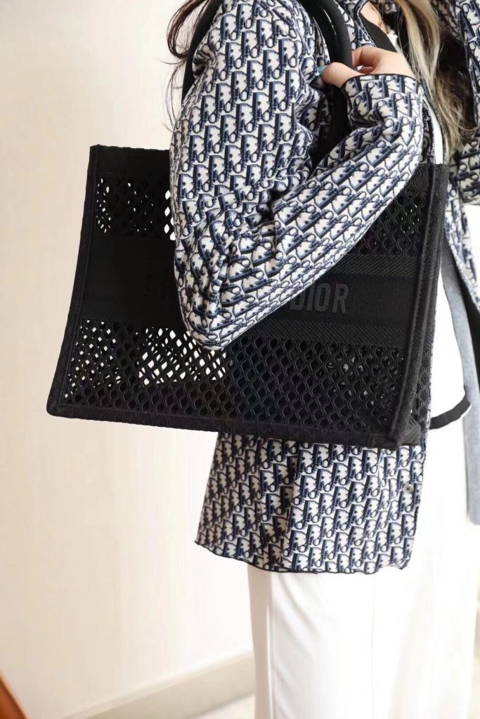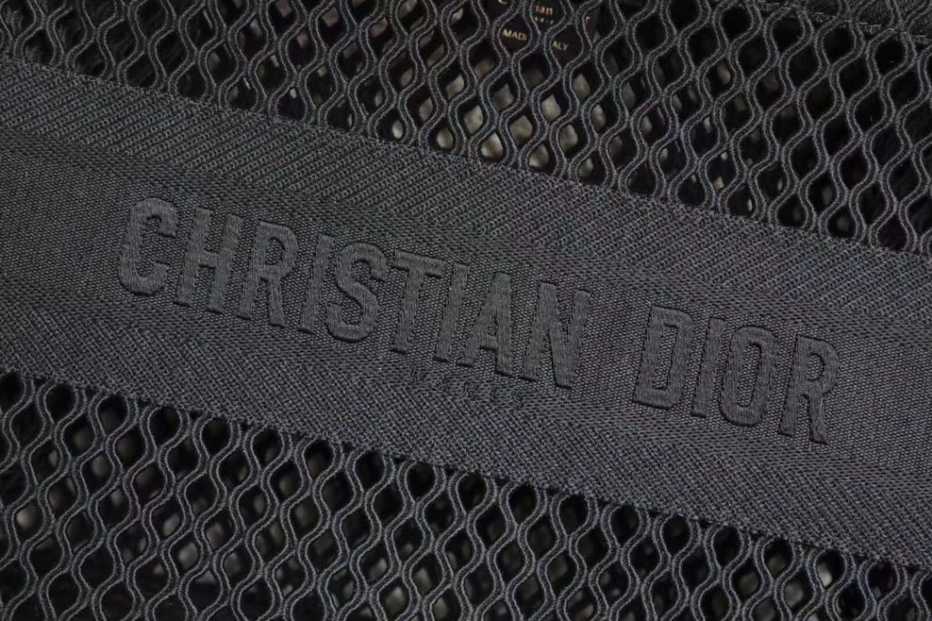 Ideally designed to carry all your daily essentials, the large shape is crafted in black cotton that has been embroidered with a mesh effect and boasts a ‘Christian Dior’ signature on the front.