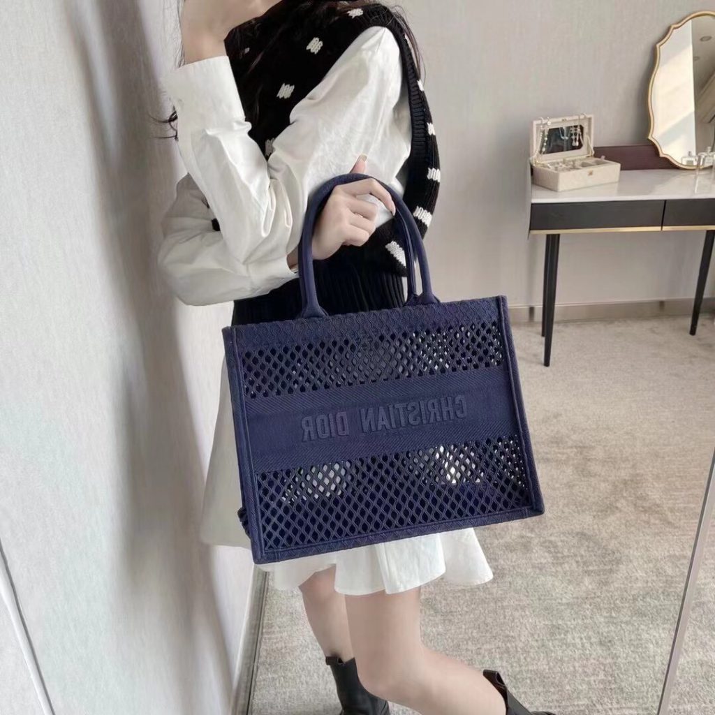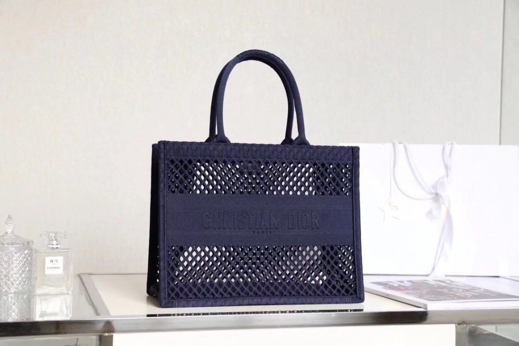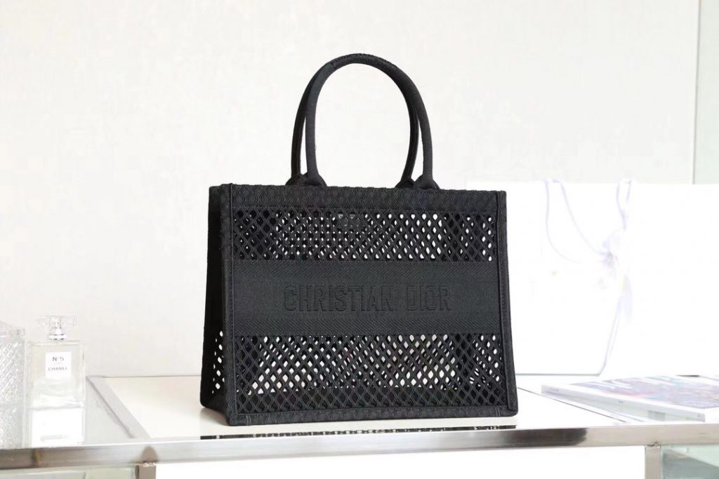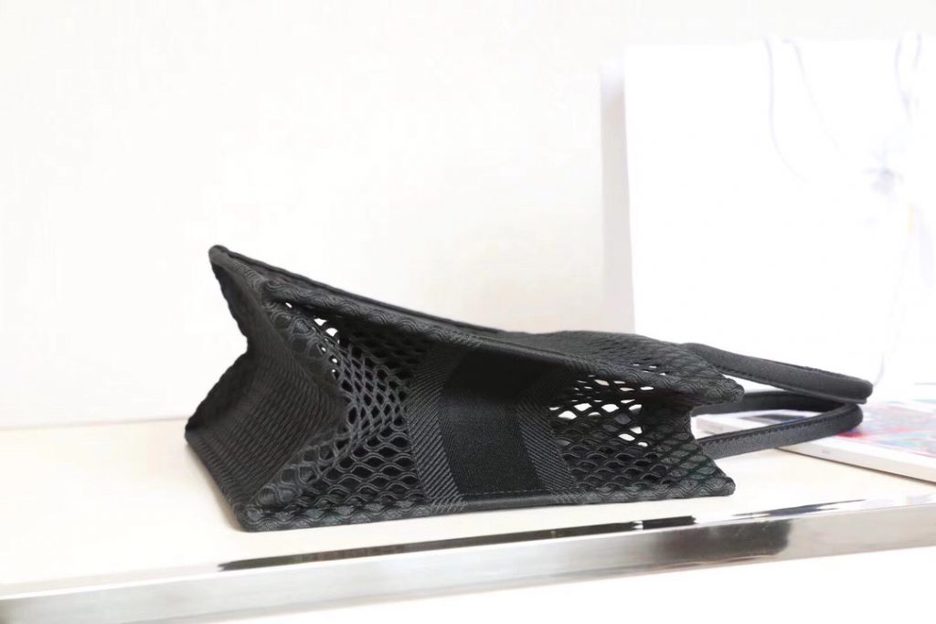 Ideally designed to carry all your daily essentials, the large shape is crafted in black cotton that has been embroidered with a mesh effect and boasts a ‘Christian Dior’ signature on the front.
