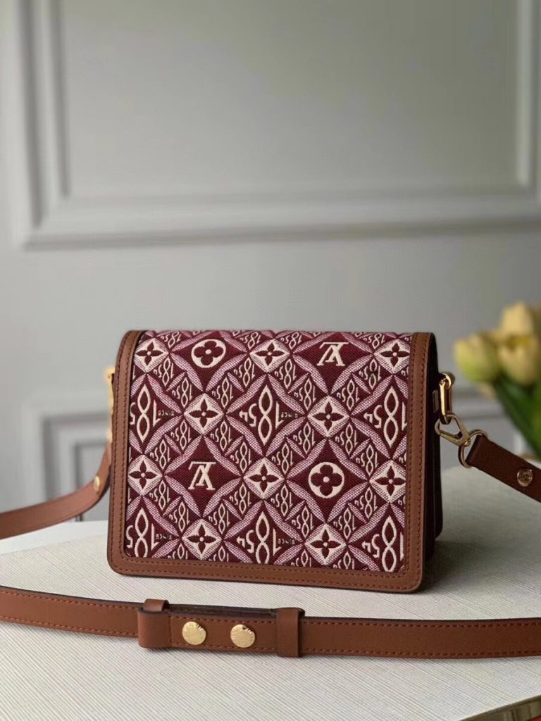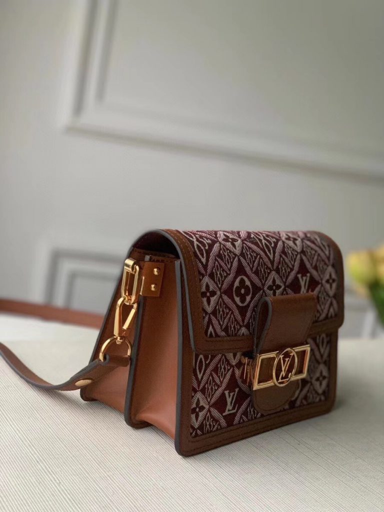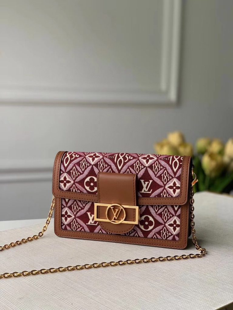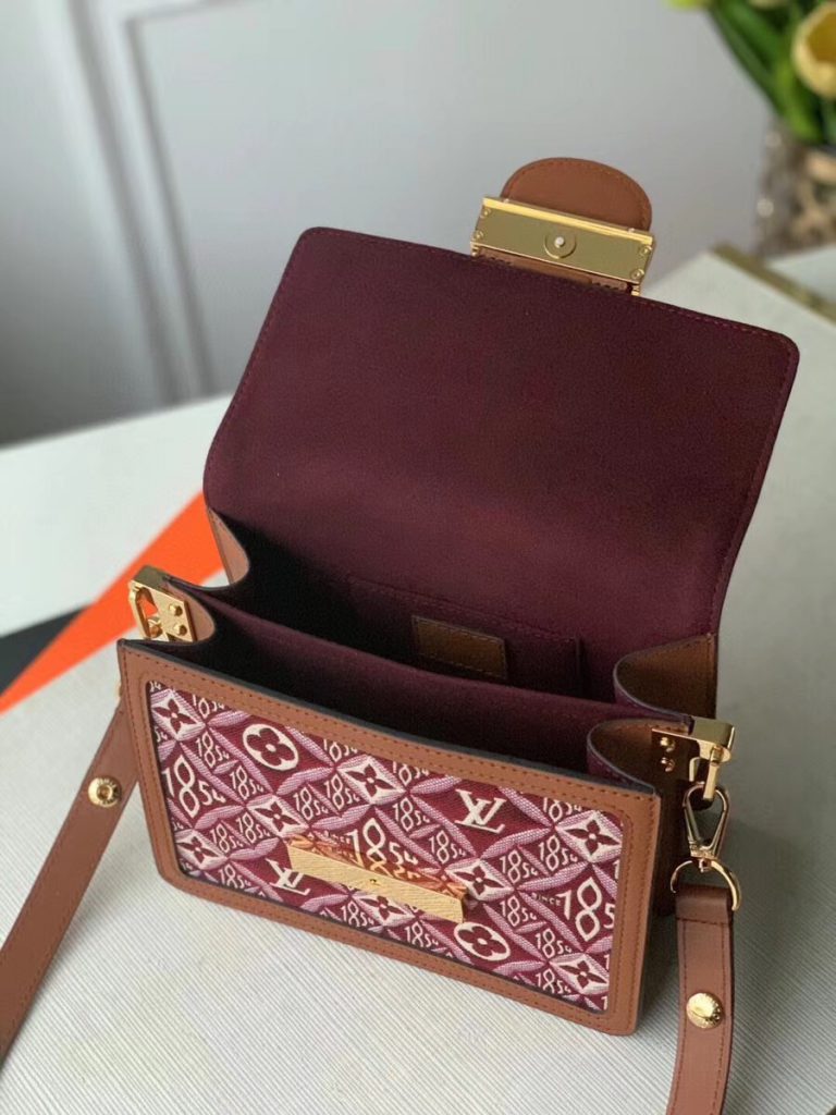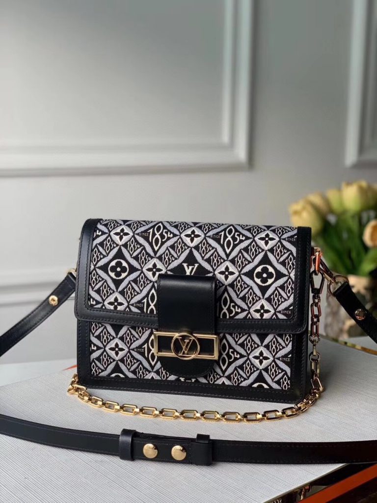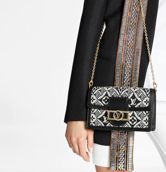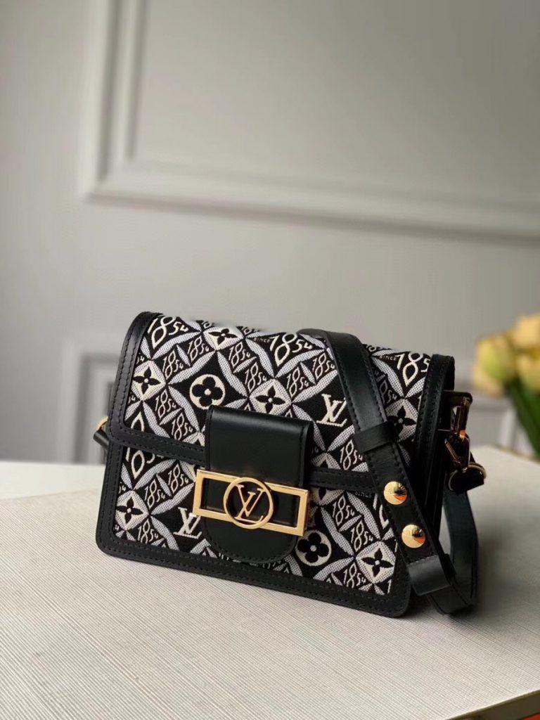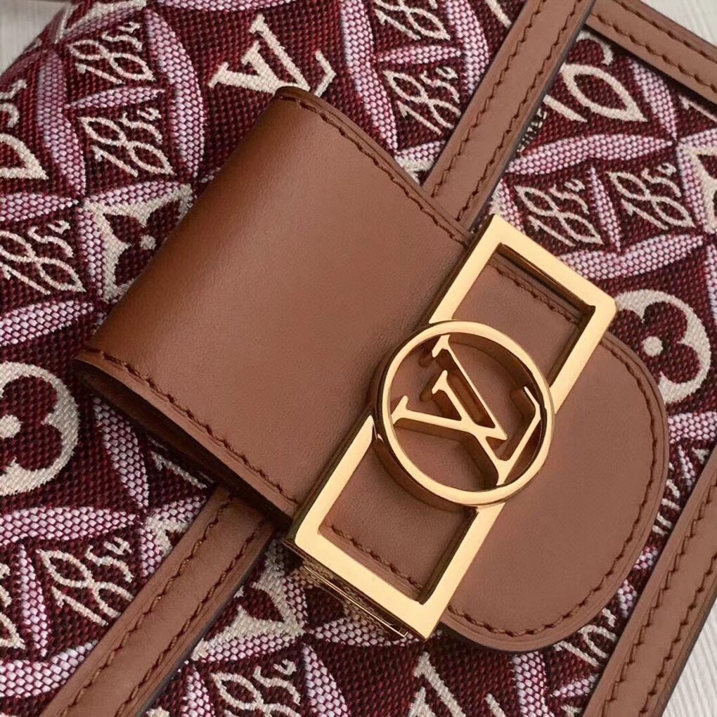 The OnTheGo MM tote bag is made from Since 1854 Jacquard textile in a pale-ecru shade and features caramel-color leather trim.