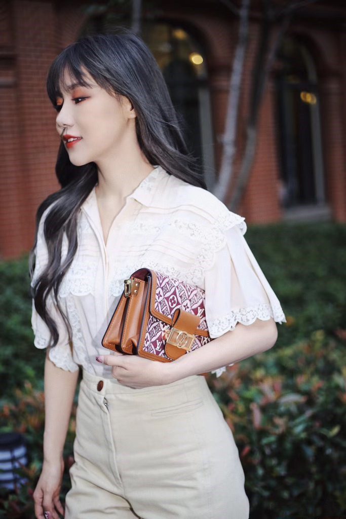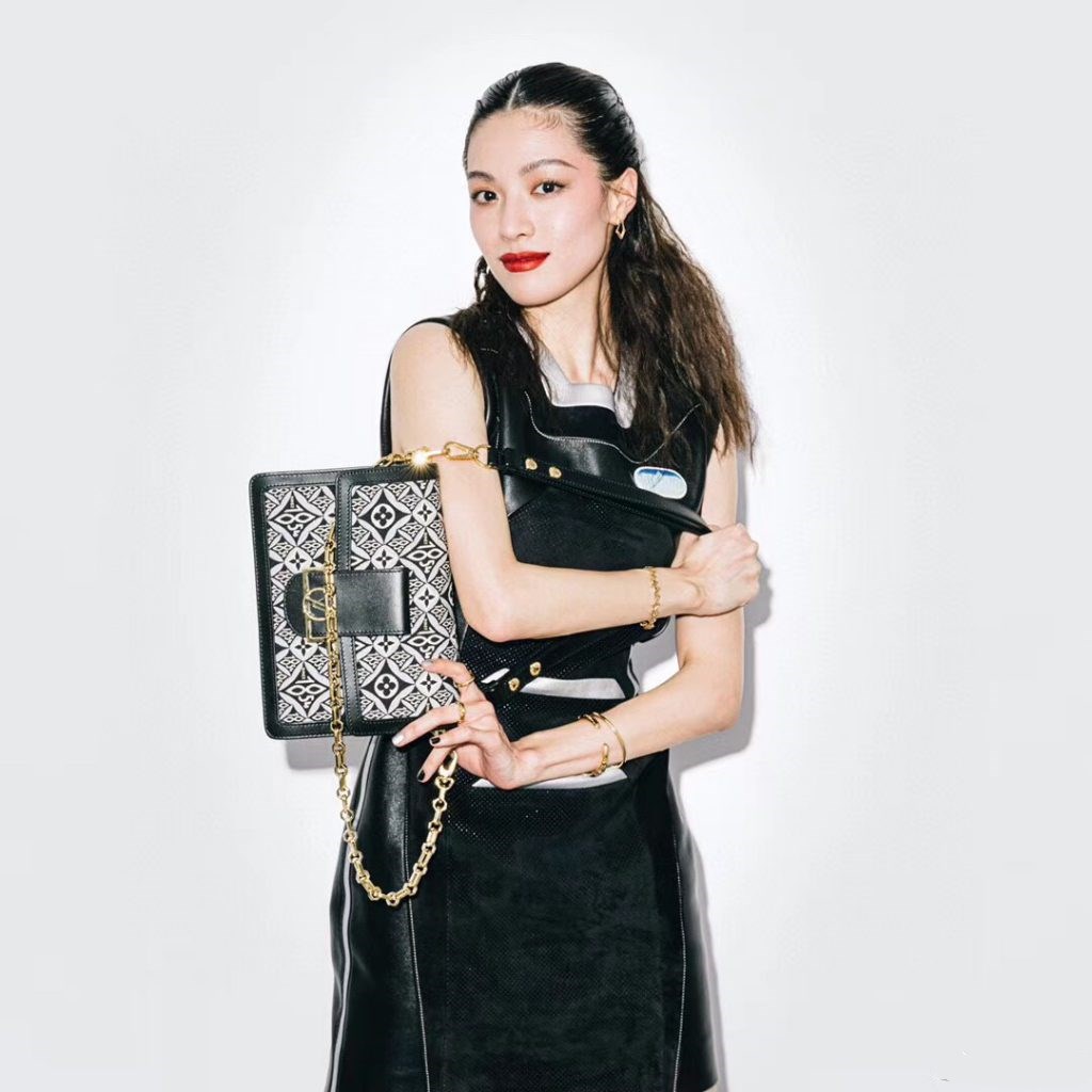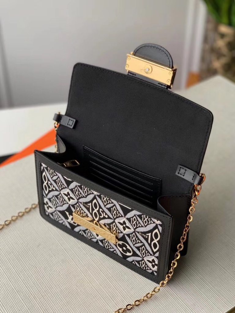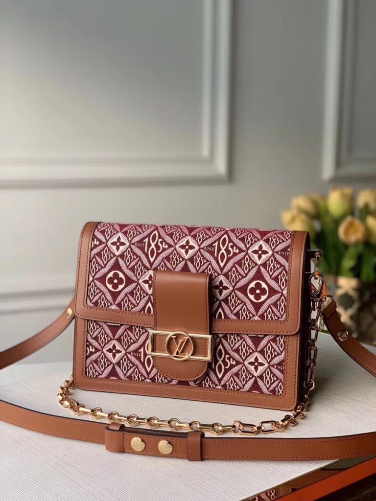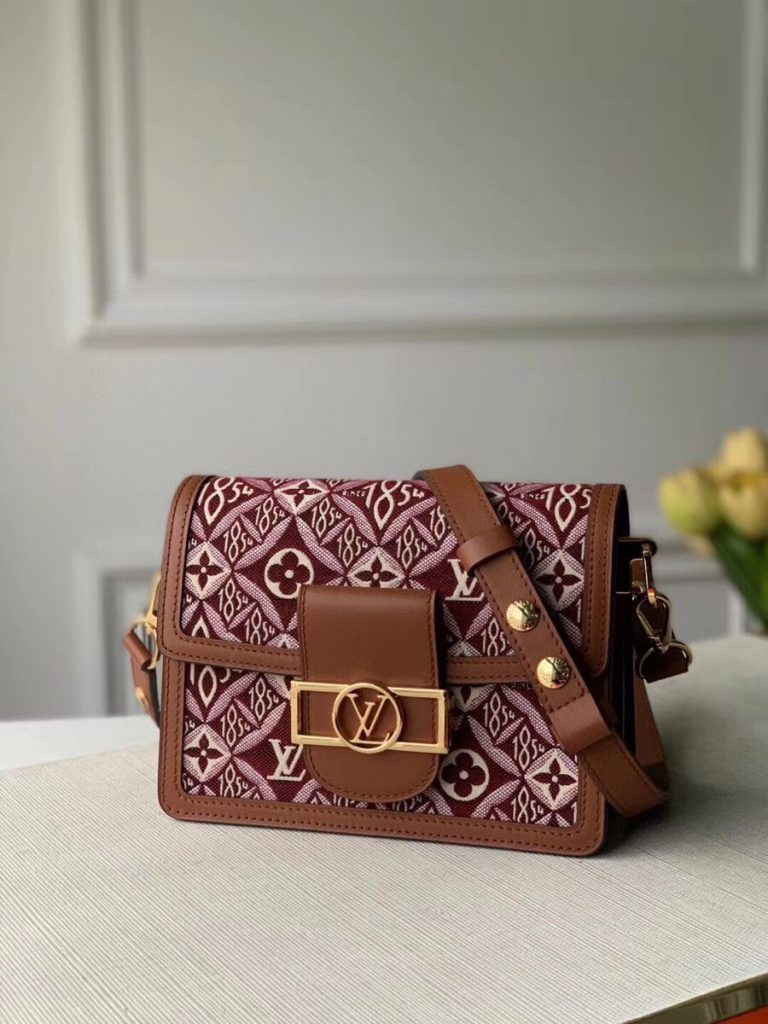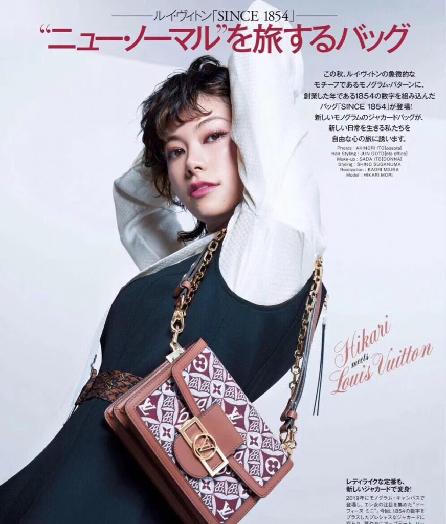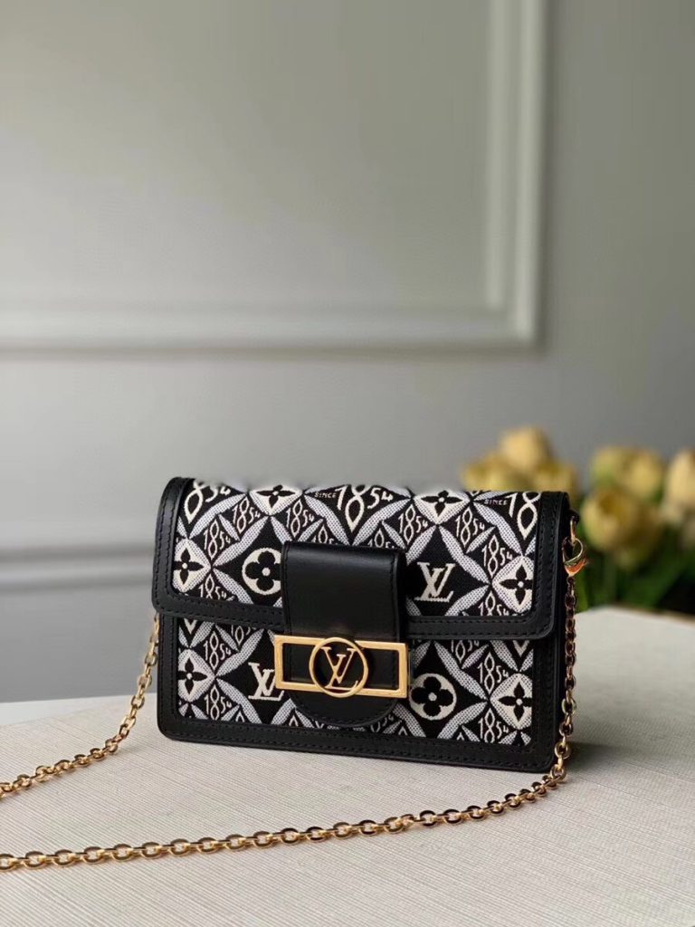 The OnTheGo MM tote bag is made from Since 1854 Jacquard textile in a pale-ecru shade and features caramel-color leather trim.