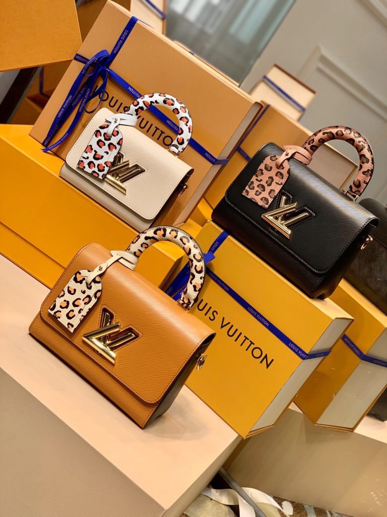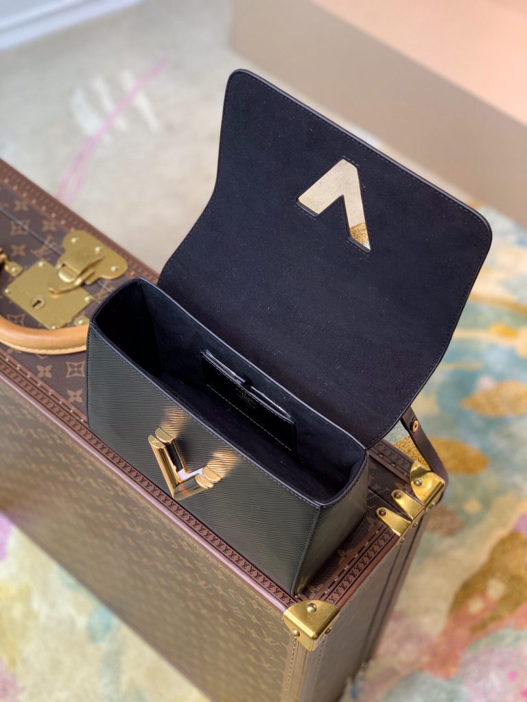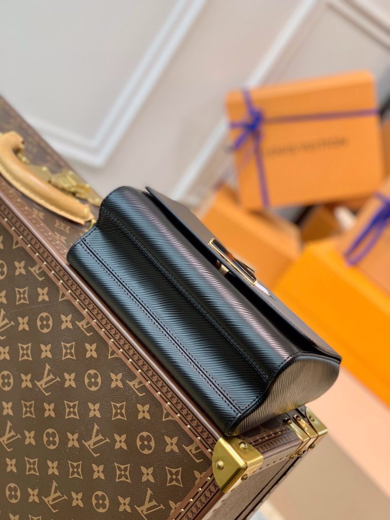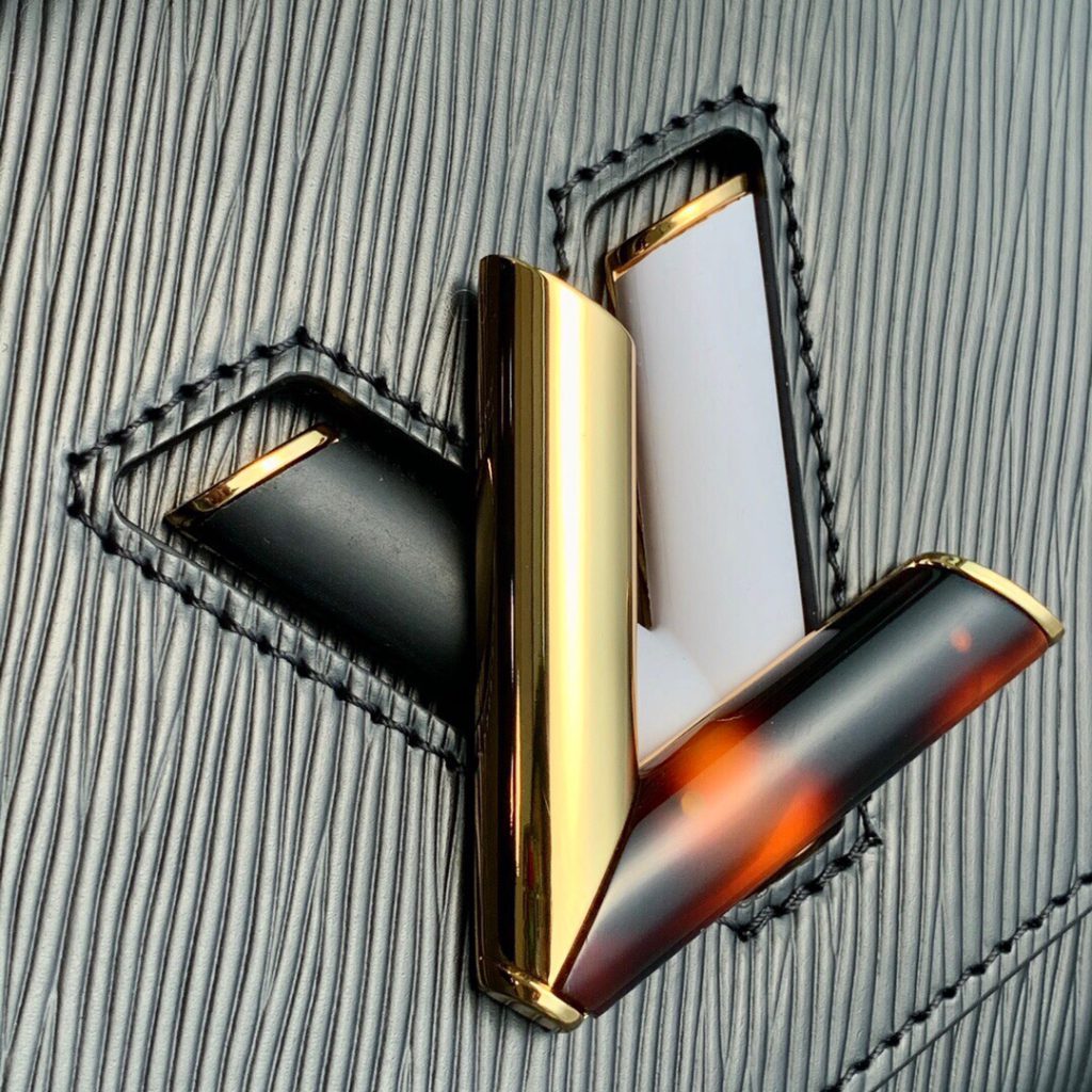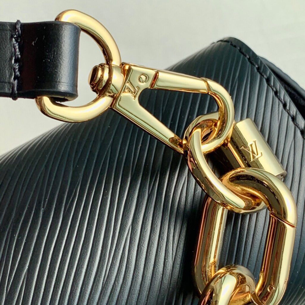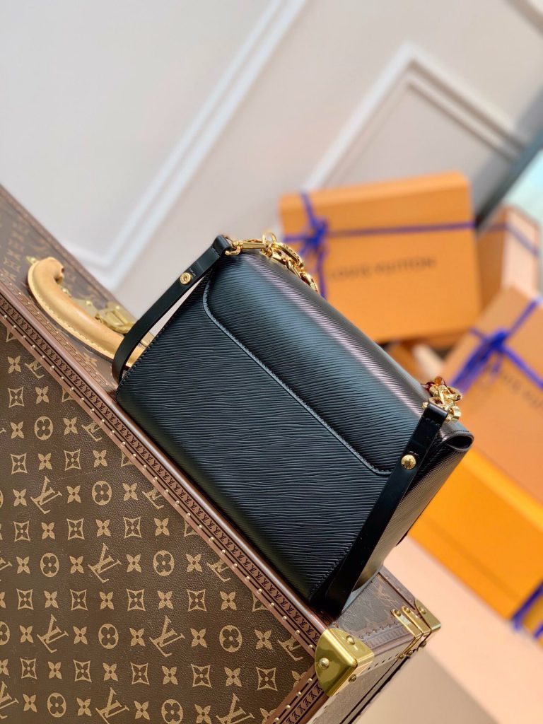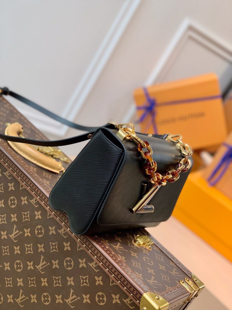 This Twist MM handbag in Epi grained leather features a LV twist-lock decorated with tortoise shell and black and white stones, a crafted detail repeated on the gold-color links of the chain.