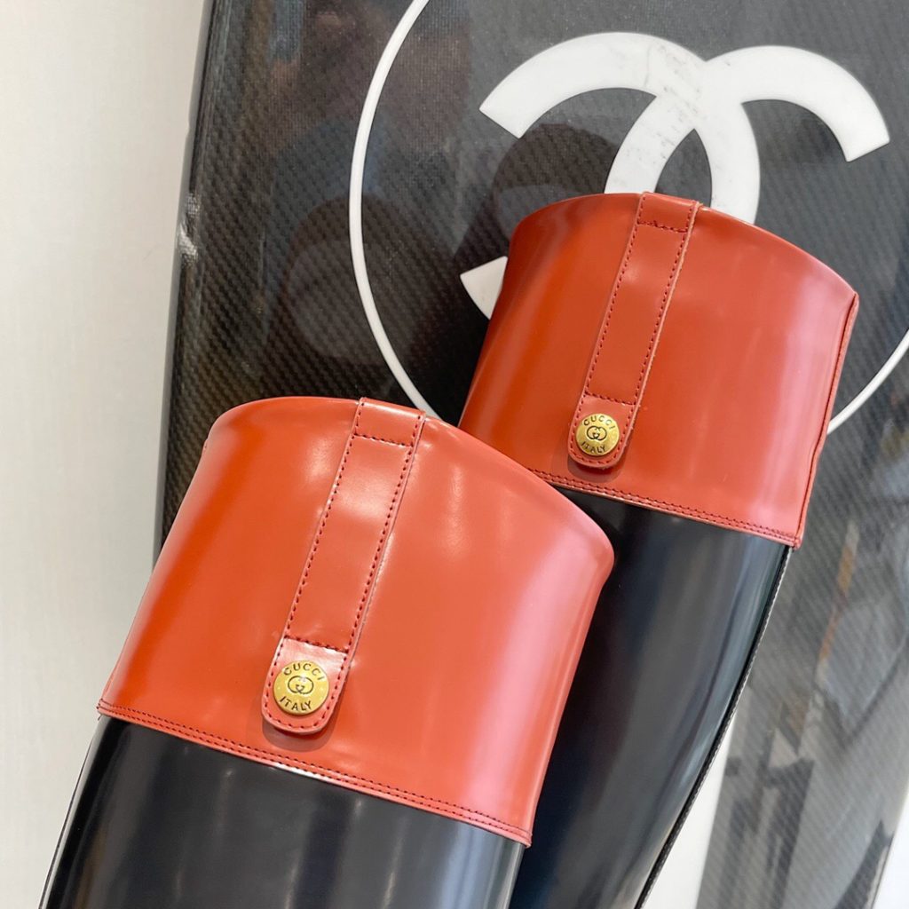 Here, this pair of knee-high leather boots is characterised by unexpected elements such as the Horsebit harness detail and the perforated Interlocking G.