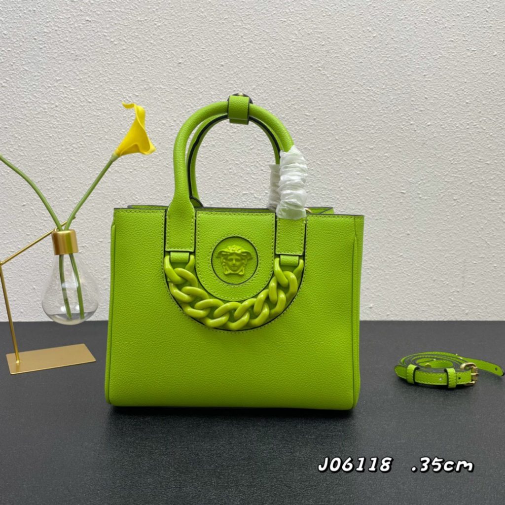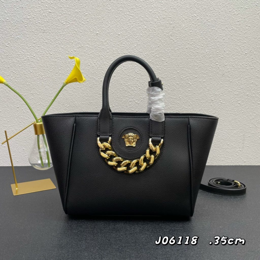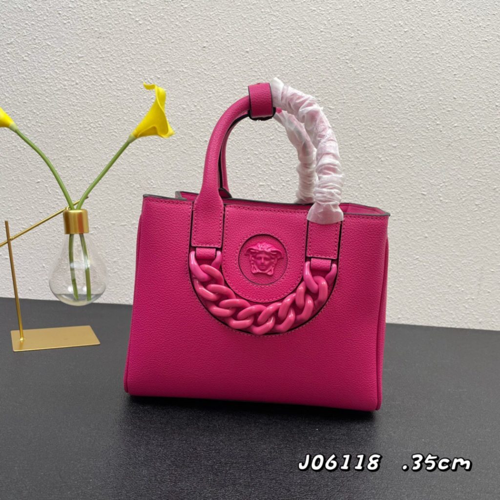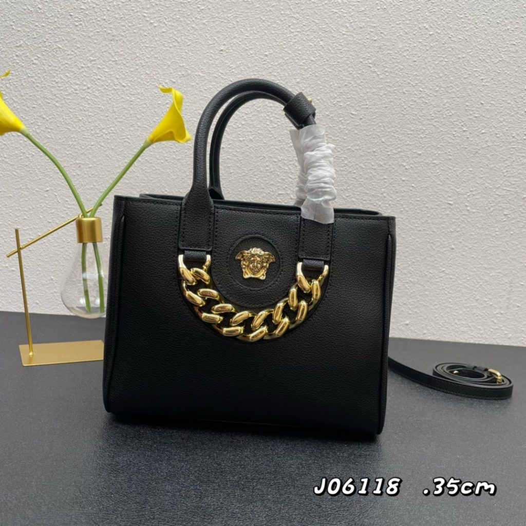 Crafted in from grained calf leather, this top-handle handbag is adorned by a signature Medusa plaque and chain