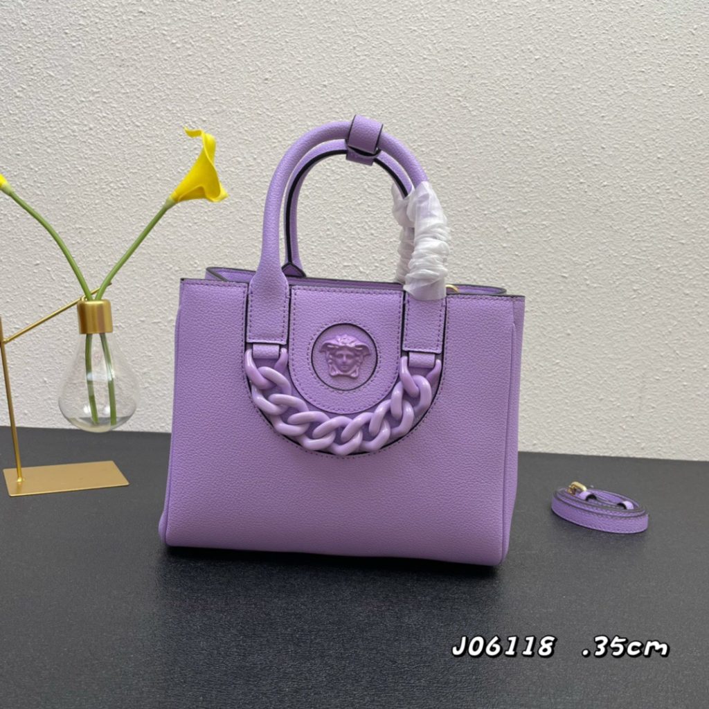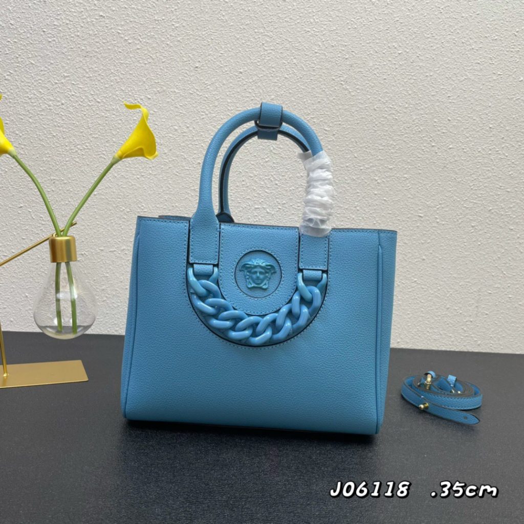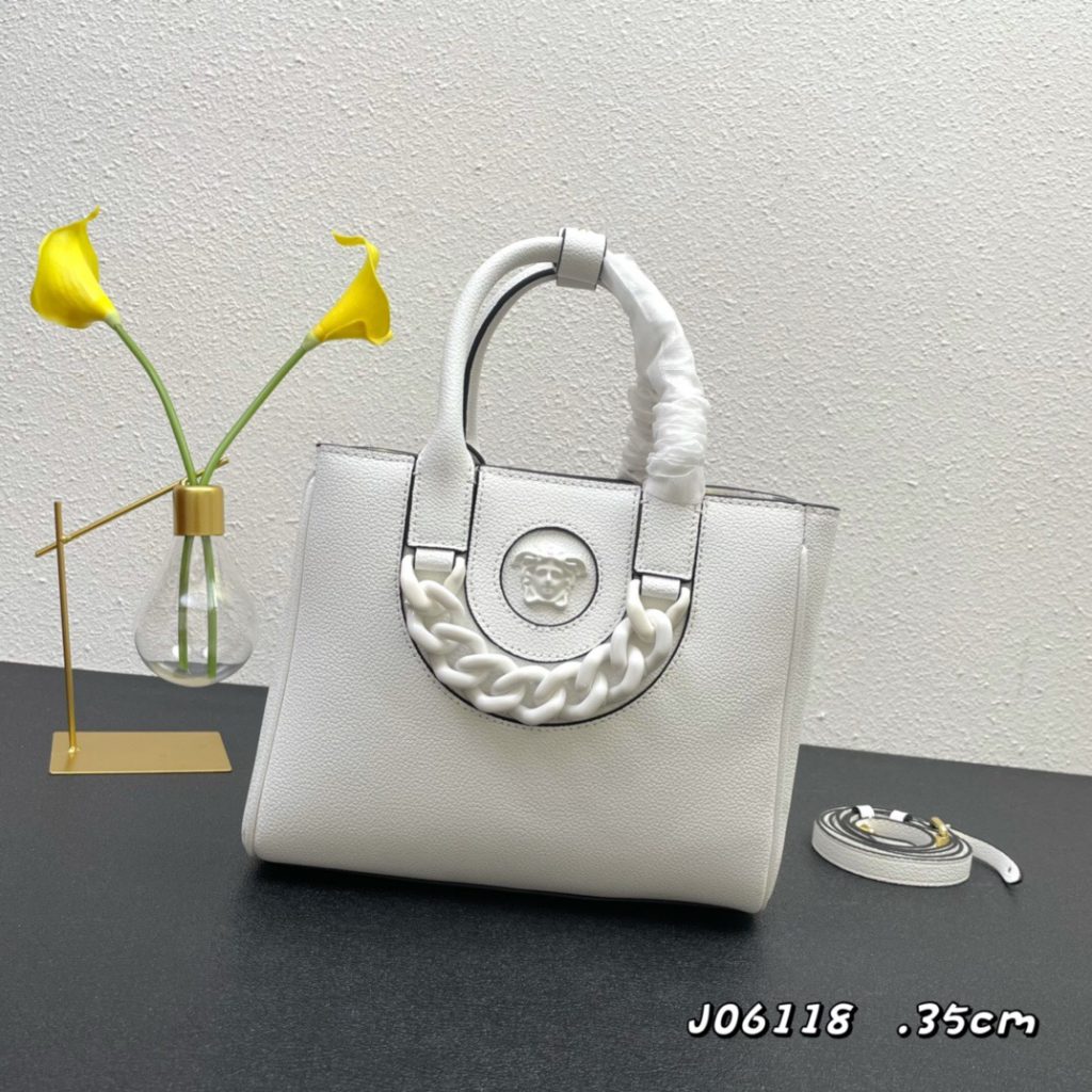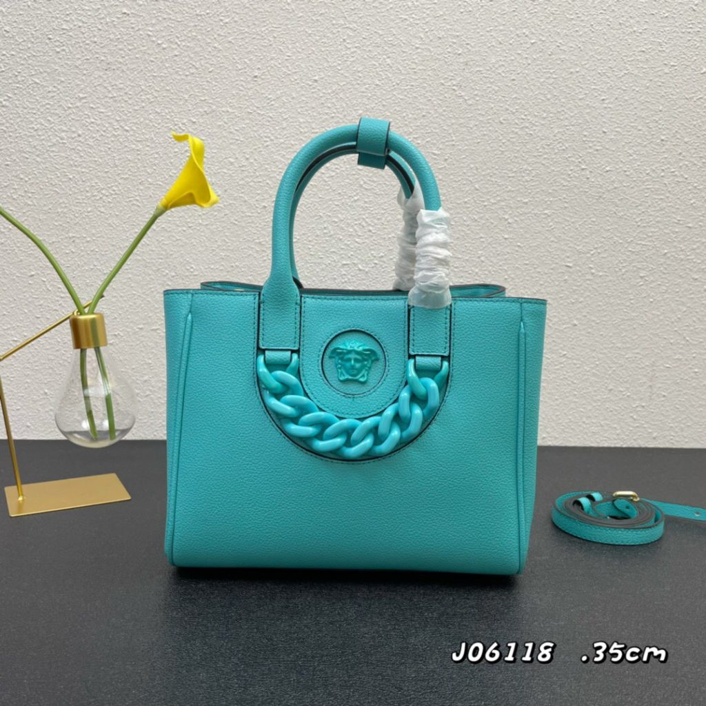 Crafted in from grained calf leather, this top-handle handbag is adorned by a signature Medusa plaque and chain