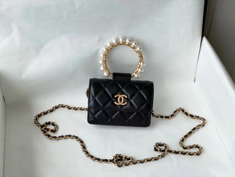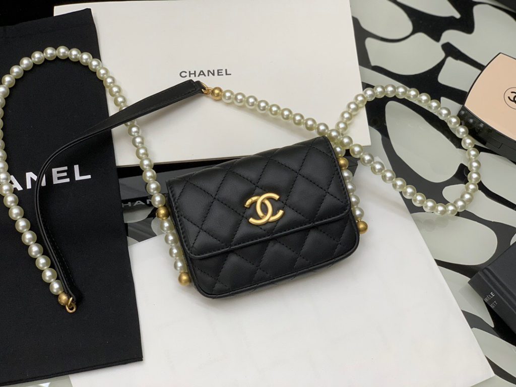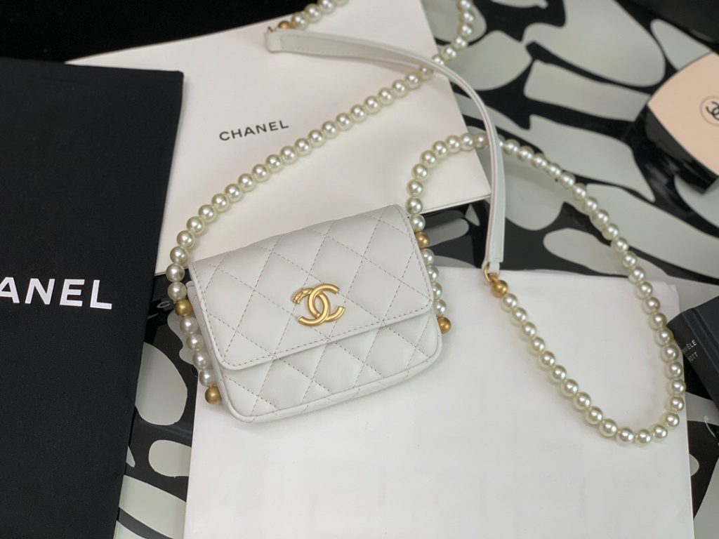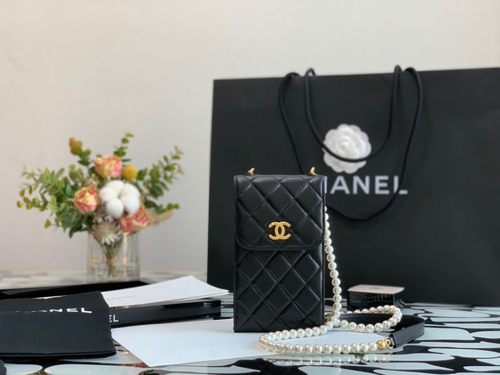 1, Calfskin Phone Holder Clutch Bag with Pearl Chain